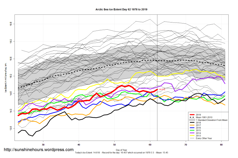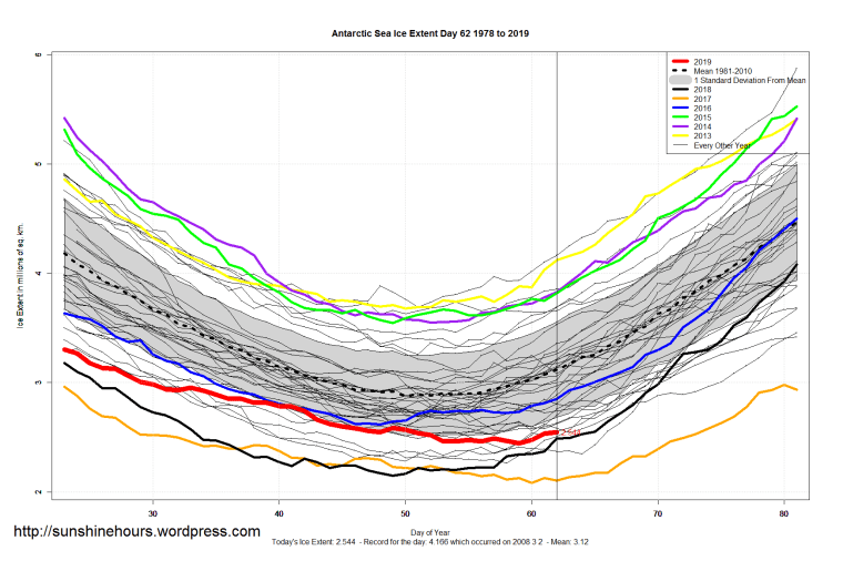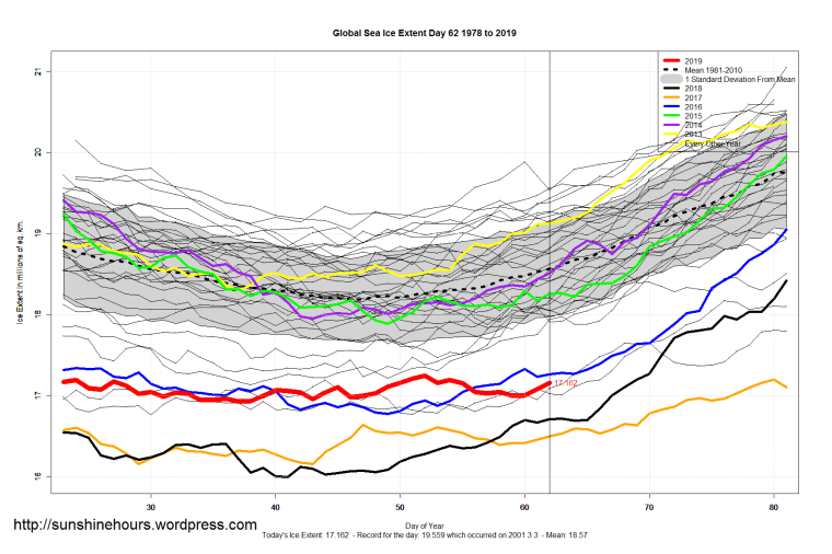 Sea Ice Extent (Global Antarctic and Arctic) – Day 62 – 2019 Published on March 4, 2019March 4, 2019 by sunshinehours1 South / North Share this: Click to share on X (Opens in new window) X Click to share on Facebook (Opens in new window) Facebook Like Loading... Related