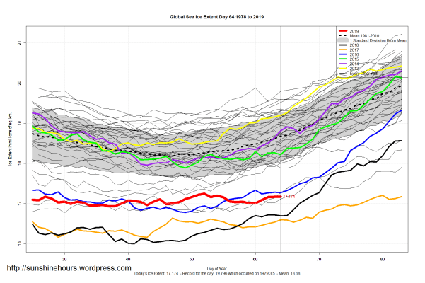 Sea Ice Extent (Global Antarctic and Arctic) – Day 64 – 2019