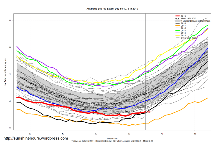 Sea Ice Extent (Global Antarctic and Arctic) – Day 65 – 2019 Published on March 7, 2019March 7, 2019 by sunshinehours1 South / North Share this: Click to share on X (Opens in new window) X Click to share on Facebook (Opens in new window) Facebook Like Loading... Related