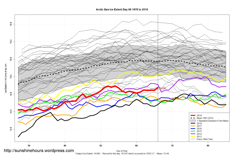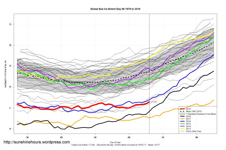 Sea Ice Extent (Global Antarctic and Arctic) – Day 66 – 2019 Published on March 8, 2019March 8, 2019 by sunshinehours1 South / North Share this: Click to share on X (Opens in new window) X Click to share on Facebook (Opens in new window) Facebook Like Loading... Related