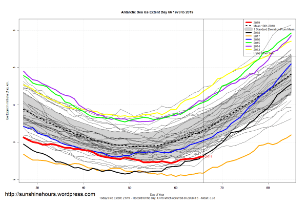 Sea Ice Extent (Global Antarctic and Arctic) – Day 66 – 2019
