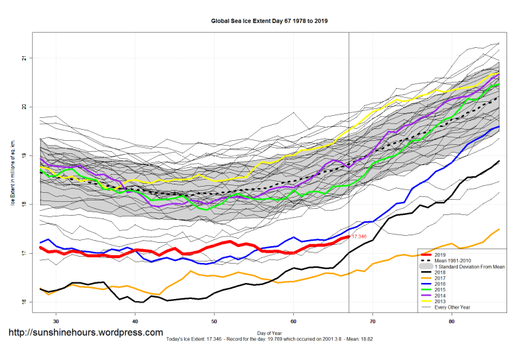 Sea Ice Extent (Global Antarctic and Arctic) – Day 67 – 2019