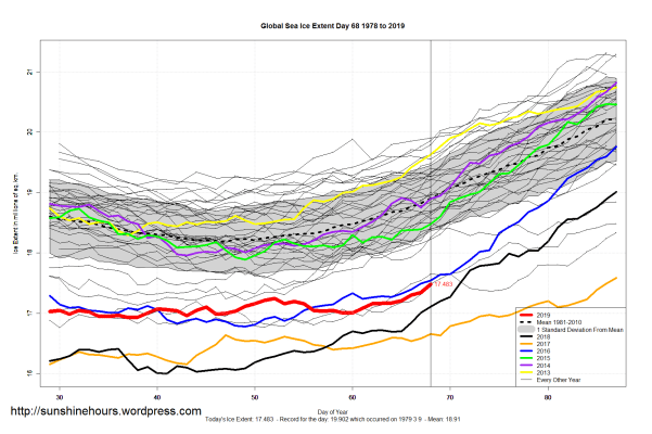 Sea Ice Extent (Global Antarctic and Arctic) – Day 68 – 2019