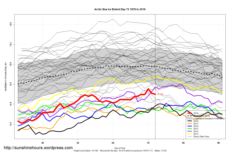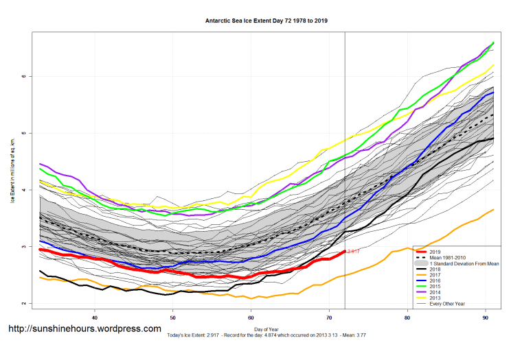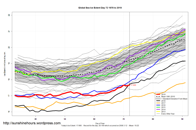 Sea Ice Extent (Global Antarctic and Arctic) – Day 72 – 2019 Published on March 14, 2019March 14, 2019 by sunshinehours1 South / North Share this: Click to share on X (Opens in new window) X Click to share on Facebook (Opens in new window) Facebook Like Loading... Related