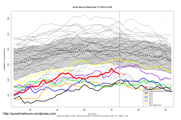 Sea Ice Extent (Global Antarctic and Arctic) – Day 73 – 2019