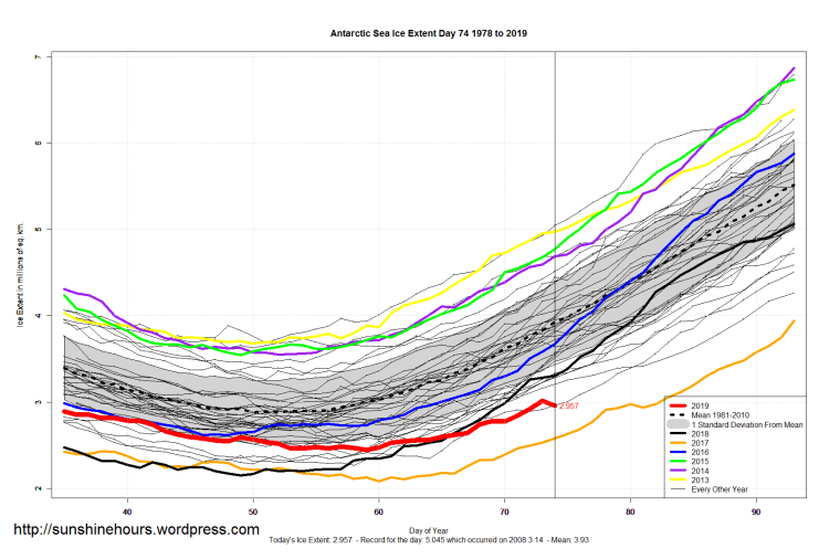 3 thoughts on “Sea Ice Extent (Global Antarctic and Arctic) – Day 74 – 2019