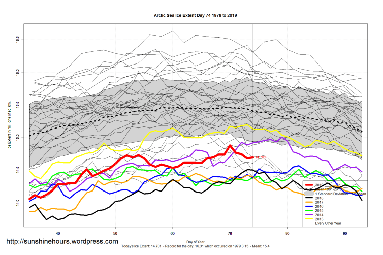Sea Ice Extent (Global Antarctic and Arctic) – Day 74 – 2019