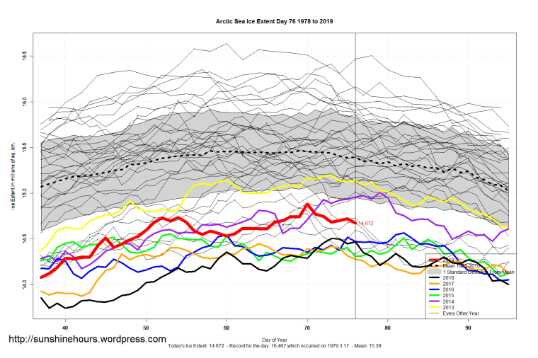 Sea Ice Extent (Global Antarctic and Arctic) – Day 76 – 2019 Published on March 18, 2019March 18, 2019 by sunshinehours1 South / North Share this: Click to share on X (Opens in new window) X Click to share on Facebook (Opens in new window) Facebook Like Loading... Related