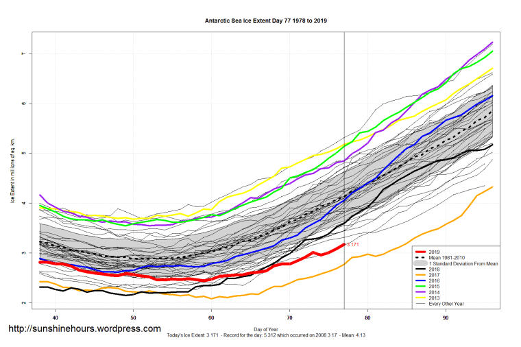 3 thoughts on “Sea Ice Extent (Global Antarctic and Arctic) – Day 77 – 2019