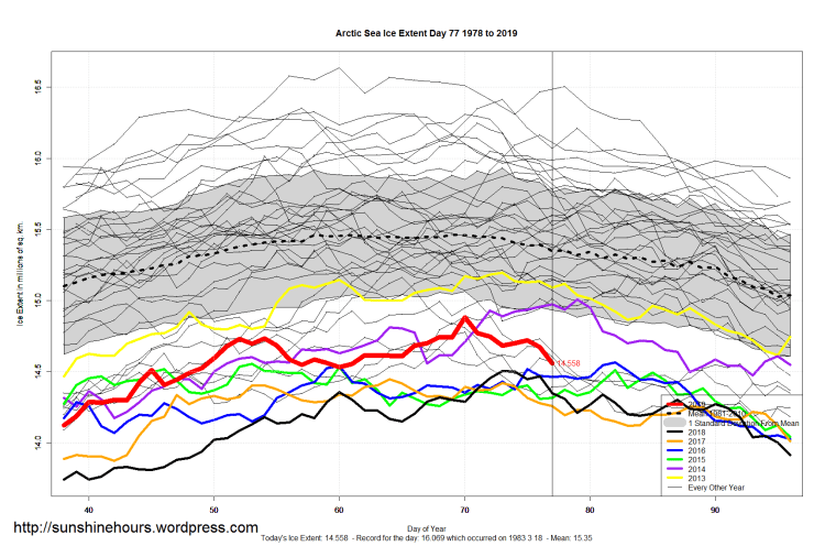 Sea Ice Extent (Global Antarctic and Arctic) – Day 77 – 2019