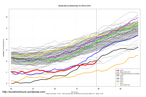 Arctic Higher Than 2005, 2006 and 2007 – Sea Ice Extent (Global Antarctic and Arctic) – Day 79 – 2019