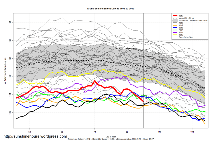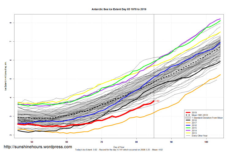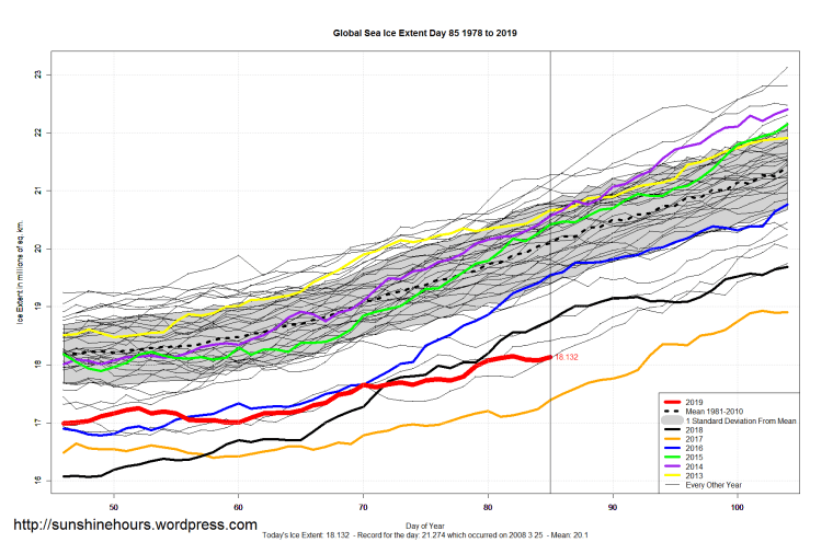 Sea Ice Extent (Global Antarctic and Arctic) – Day 85 – 2019 Published on March 27, 2019March 27, 2019 by sunshinehours1 South / North Share this: Click to share on X (Opens in new window) X Click to share on Facebook (Opens in new window) Facebook Like Loading... Related