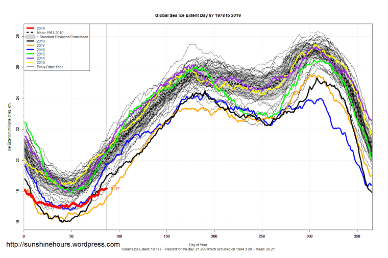 Sea Ice Extent (Global Antarctic and Arctic) – Day 87 – 2019 Published on March 29, 2019March 29, 2019 by sunshinehours1 South / North Share this: Click to share on X (Opens in new window) X Click to share on Facebook (Opens in new window) Facebook Like Loading... Related