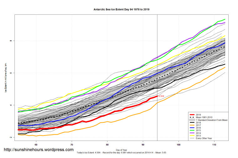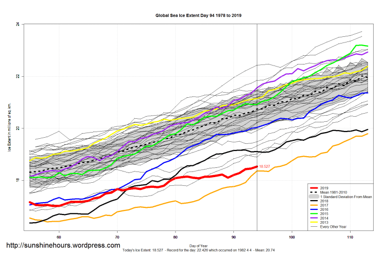 Sea Ice Extent (Global Antarctic and Arctic) – Day 94 – 2019 Published on April 5, 2019April 5, 2019 by sunshinehours1 South / North Share this: Click to share on X (Opens in new window) X Click to share on Facebook (Opens in new window) Facebook Like Loading... Related