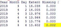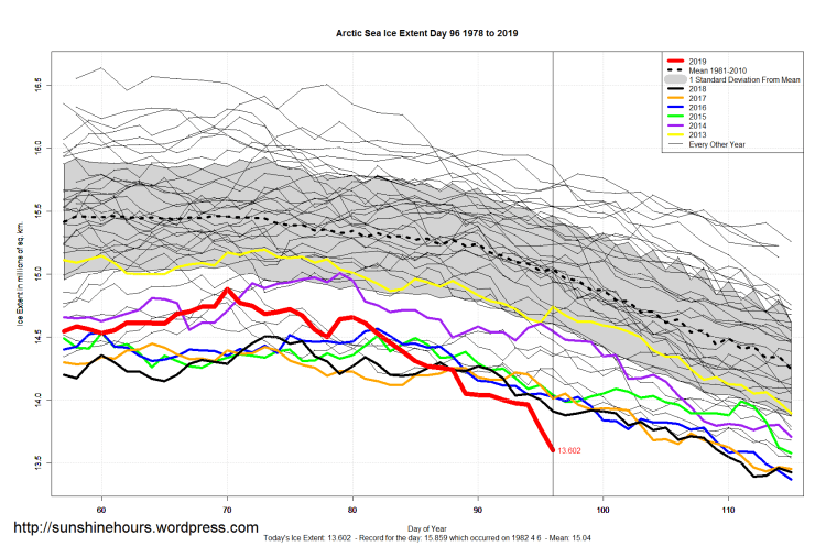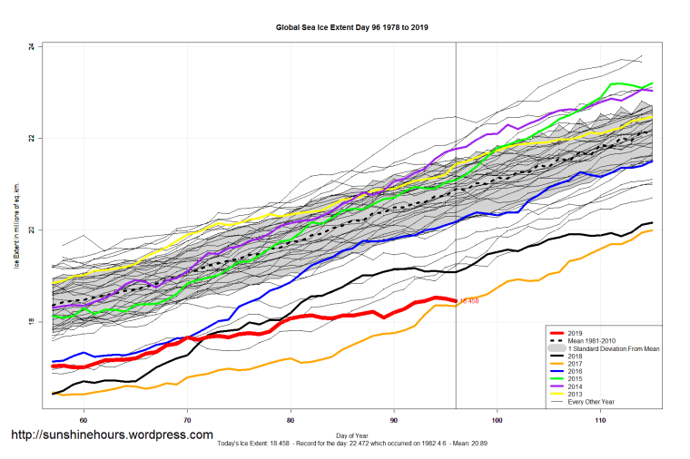 Sea Ice Extent (Global Antarctic and Arctic) – Day 96 – 2019 Published on April 7, 2019April 7, 2019 by sunshinehours1 Big drop in Arctic. But the Missing column has a value which means the data is incomplete. We’ll find out tomorrow. Possibly. South / North Share this: Click to share on X (Opens in new window) X Click to share on Facebook (Opens in new window) Facebook Like Loading... Related
