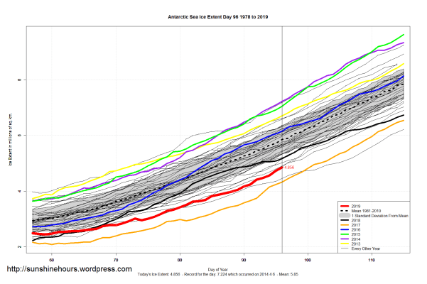 Sea Ice Extent (Global Antarctic and Arctic) – Day 96 – 2019