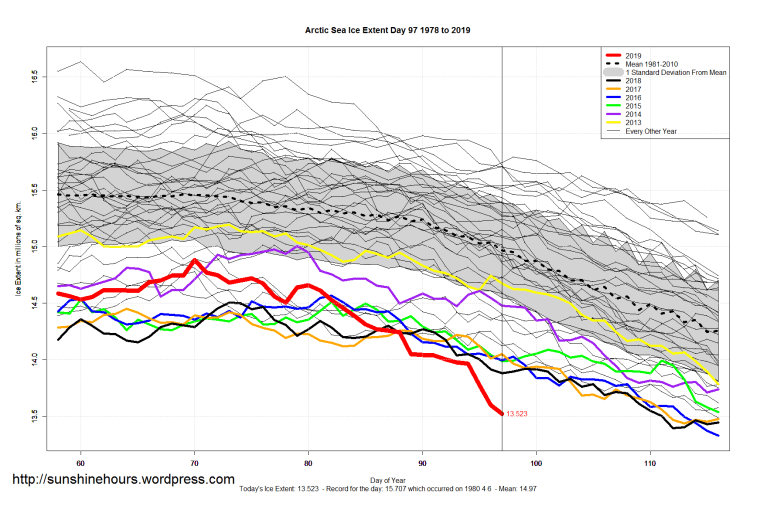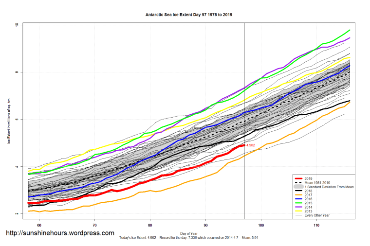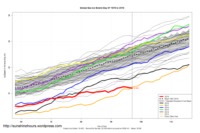 Sea Ice Extent (Global Antarctic and Arctic) – Day 97 – 2019 Published on April 8, 2019April 8, 2019 by sunshinehours1 South / North Share this: Click to share on X (Opens in new window) X Click to share on Facebook (Opens in new window) Facebook Like Loading... Related