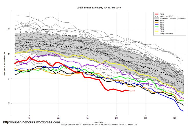 Sea Ice Extent (Global Antarctic and Arctic) – Day 104 – 2019 Published on April 15, 2019April 15, 2019 by sunshinehours1 South / North Share this: Click to share on X (Opens in new window) X Click to share on Facebook (Opens in new window) Facebook Like Loading... Related