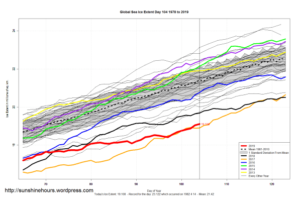 Sea Ice Extent (Global Antarctic and Arctic) – Day 104 – 2019