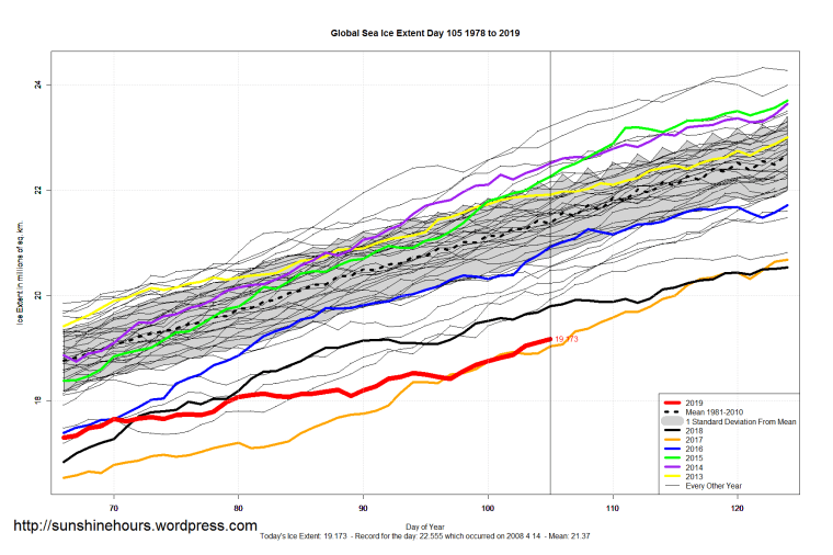Sea Ice Extent (Global Antarctic and Arctic) – Day 105 – 2019 Published on April 16, 2019April 16, 2019 by sunshinehours1 South / North Share this: Click to share on X (Opens in new window) X Click to share on Facebook (Opens in new window) Facebook Like Loading... Related