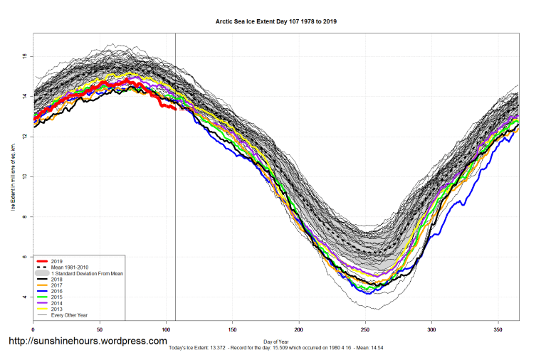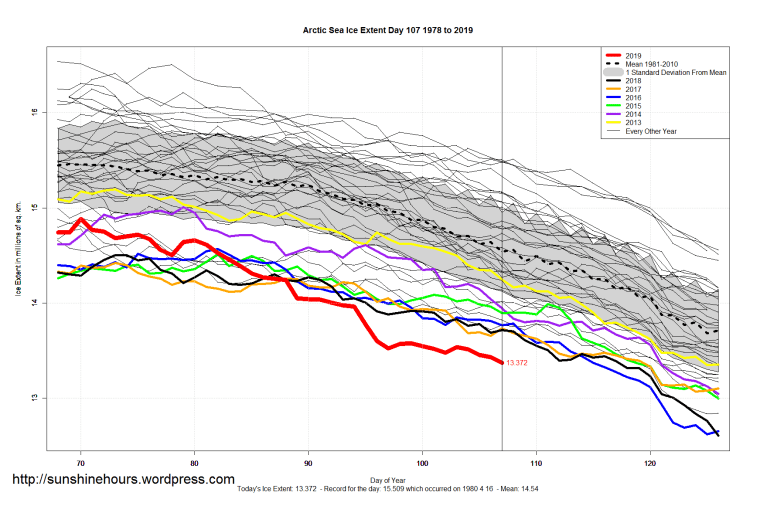Arctic 8.7% Below Mean – Sea Ice Extent (Global Antarctic and Arctic) – Day 107 – 2019 Published on April 18, 2019April 18, 2019 by sunshinehours1 Despite the Arctic being at record lows for this time of year, it is only 8.7% below the mean. Mean = 14.64 Extent = 13.37 Anomaly = -1.27 Five weeks ago on day 70 it was only 4% below the mean. South / North Share this: Click to share on X (Opens in new window) X Click to share on Facebook (Opens in new window) Facebook Like Loading... Related
