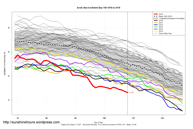 Sea Ice Extent (Global Antarctic and Arctic) – Day 108 – 2019