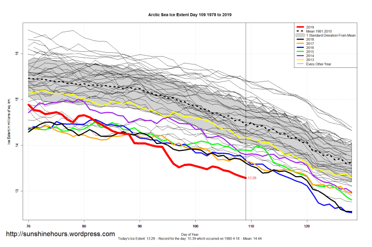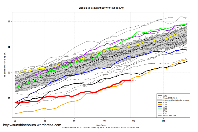 Sea Ice Extent (Global Antarctic and Arctic) – Day 109 – 2019 Published on April 20, 2019April 20, 2019 by sunshinehours1 South / North Share this: Click to share on X (Opens in new window) X Click to share on Facebook (Opens in new window) Facebook Like Loading... Related
