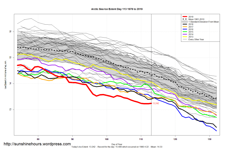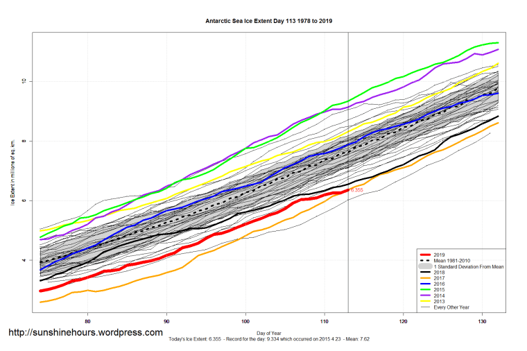 Sea Ice Extent (Global Antarctic and Arctic) – Day 113 – 2019 Published on April 24, 2019April 24, 2019 by sunshinehours1 South / North Share this: Click to share on X (Opens in new window) X Click to share on Facebook (Opens in new window) Facebook Like Loading... Related