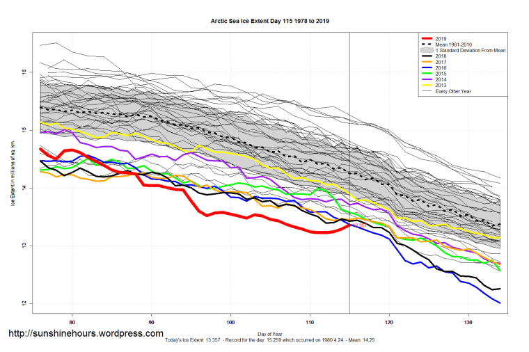 Arctic Bouncing Back – Sea Ice Extent (Global Antarctic and Arctic) – Day 115 – 2019 Published on April 26, 2019April 26, 2019 by sunshinehours1 The Arctic is recovering from its 3 week dip into record low territory. South / North Share this: Click to share on X (Opens in new window) X Click to share on Facebook (Opens in new window) Facebook Like Loading... Related