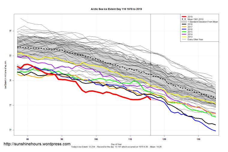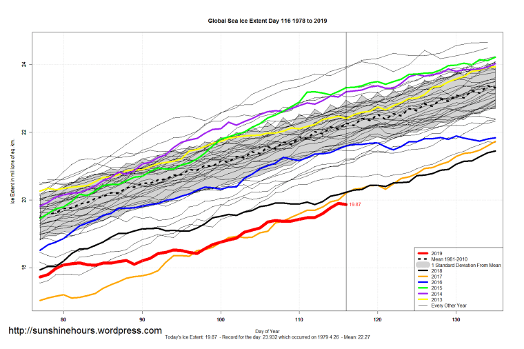 Sea Ice Extent (Global Antarctic and Arctic) – Day 116 – 2019 Published on April 27, 2019April 27, 2019 by sunshinehours1 South / North Share this: Click to share on X (Opens in new window) X Click to share on Facebook (Opens in new window) Facebook Like Loading... Related