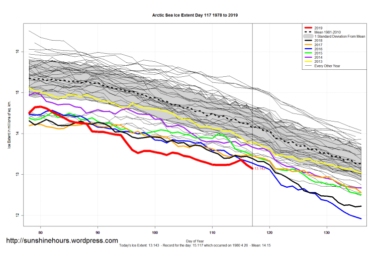 Sea Ice Extent (Global Antarctic and Arctic) – Day 117 – 2019 Published on April 28, 2019April 28, 2019 by sunshinehours1 South / North Share this: Click to share on X (Opens in new window) X Click to share on Facebook (Opens in new window) Facebook Like Loading... Related