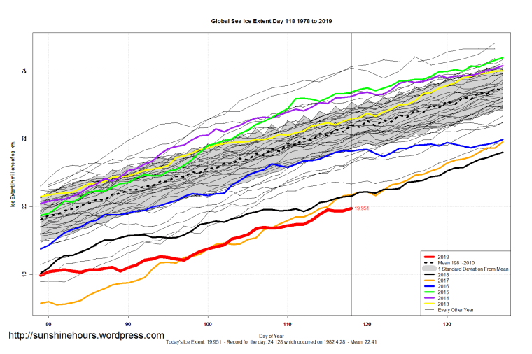 Sea Ice Extent (Global Antarctic and Arctic) – Day 118 – 2019 Published on April 29, 2019April 29, 2019 by sunshinehours1 South / North Share this: Click to share on X (Opens in new window) X Click to share on Facebook (Opens in new window) Facebook Like Loading... Related