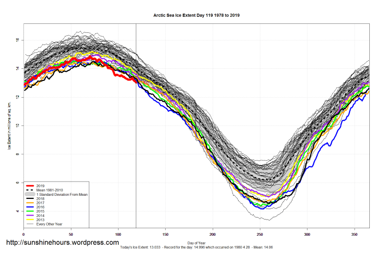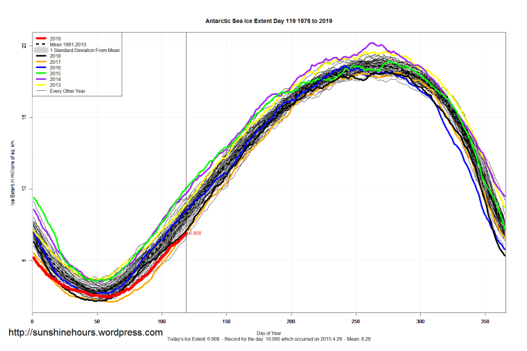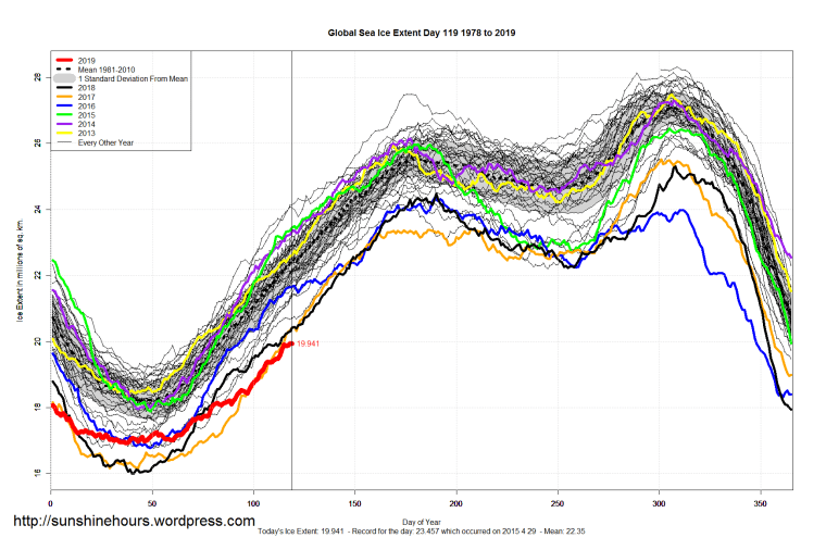Sea Ice Extent (Global Antarctic and Arctic) – Day 119 – 2019 Published on April 30, 2019April 30, 2019 by sunshinehours1 South / North Share this: Click to share on X (Opens in new window) X Click to share on Facebook (Opens in new window) Facebook Like Loading... Related