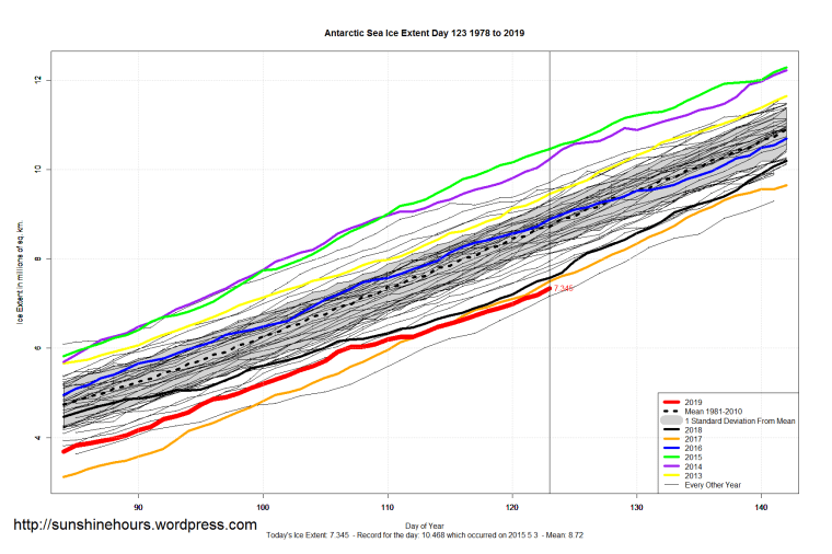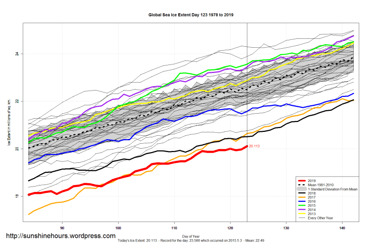 Sea Ice Extent (Global Antarctic and Arctic) – Day 123 – 2019 Published on May 4, 2019May 4, 2019 by sunshinehours1 South / North Share this: Click to share on X (Opens in new window) X Click to share on Facebook (Opens in new window) Facebook Like Loading... Related
