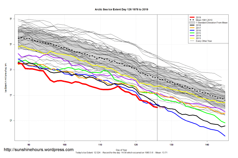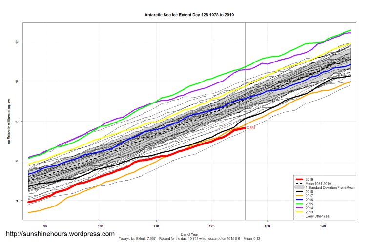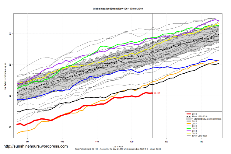 Sea Ice Extent (Global Antarctic and Arctic) – Day 126 – 2019 Published on May 7, 2019May 7, 2019 by sunshinehours1 South / North Share this: Click to share on X (Opens in new window) X Click to share on Facebook (Opens in new window) Facebook Like Loading... Related