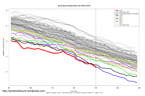 Sea Ice Extent (Global Antarctic and Arctic) – Day 130 – 2019