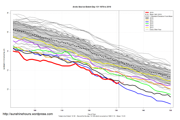 Sea Ice Extent (Global Antarctic and Arctic) – Day 131 – 2019