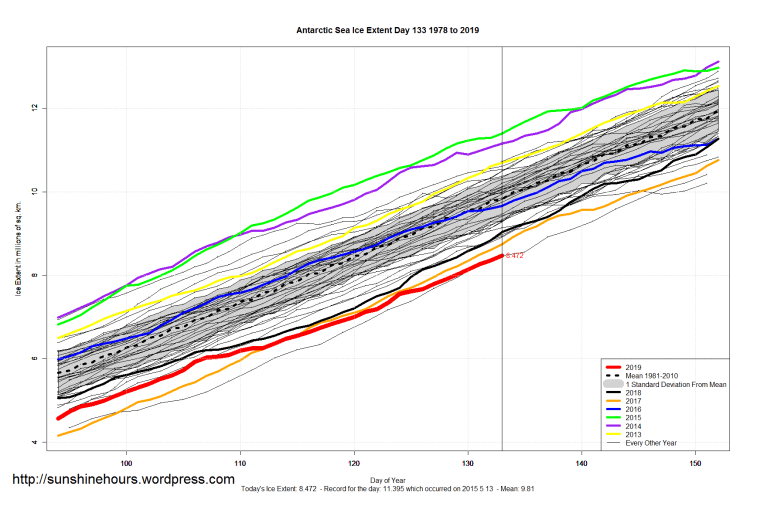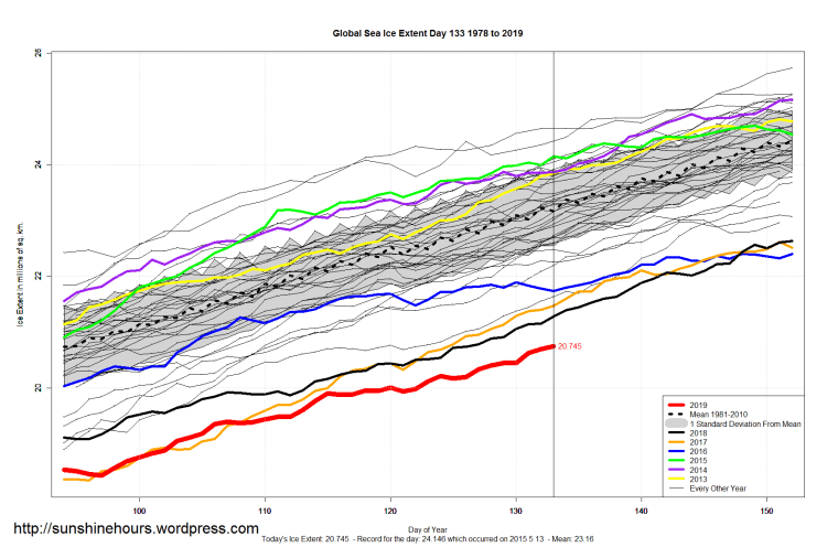 One thought on “Sea Ice Extent (Global Antarctic and Arctic) – Day 133 – 2019