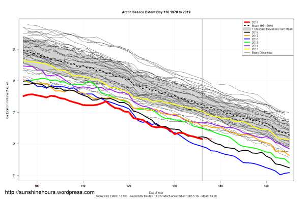 Sea Ice Extent (Global Antarctic and Arctic) – Day 136 – 2019