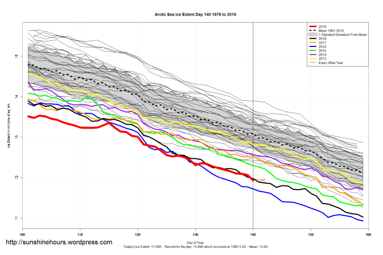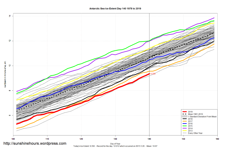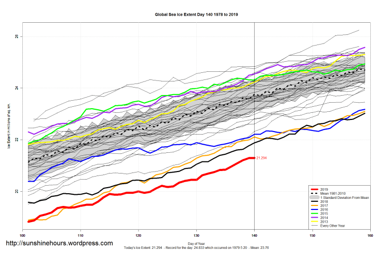 Sea Ice Extent (Global Antarctic and Arctic) – Day 140 – 2019 Published on May 21, 2019May 21, 2019 by sunshinehours1 South / North Share this: Click to share on X (Opens in new window) X Click to share on Facebook (Opens in new window) Facebook Like Loading... Related