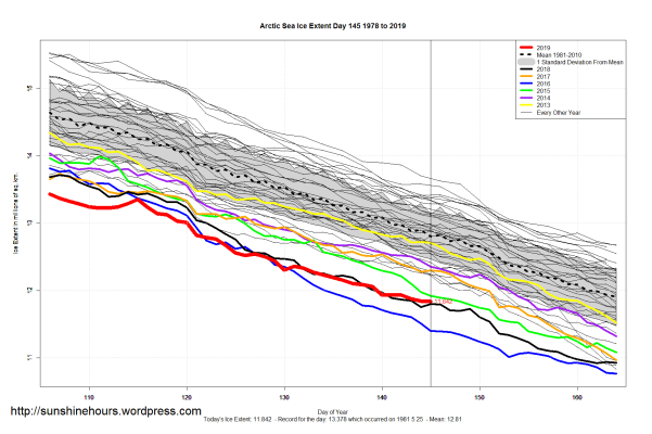 Arctic 400,000 sqkm Higher Than 2016 – Sea Ice Extent (Global Antarctic and Arctic) – Day 145 – 2019