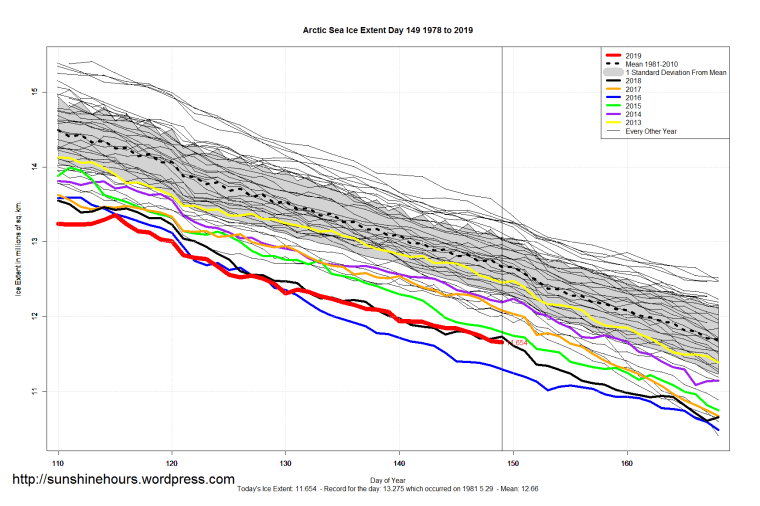 Sea Ice Extent (Global Antarctic and Arctic) – Day 149 – 2019
