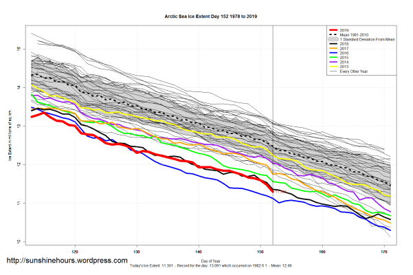 Sea Ice Extent (Global Antarctic and Arctic) – Day 152 – 2019