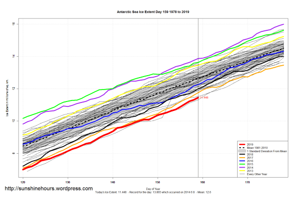 Sea Ice Extent (Global Antarctic and Arctic) – Day 159 – 2019