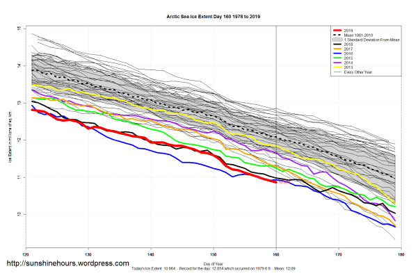 Sea Ice Extent (Global Antarctic and Arctic) – Day 160 – 2019