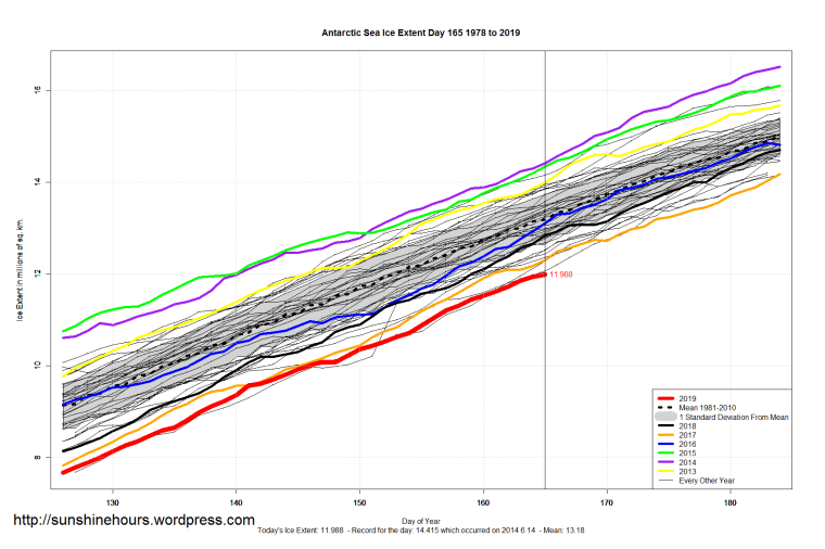 2 thoughts on “Arctic Adds 160,000 sq km in 3 days – Sea Ice Extent (Global Antarctic and Arctic) – Day 165 – 2019