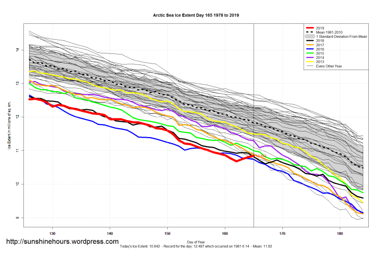 Arctic Adds 160,000 sq km in 3 days – Sea Ice Extent (Global Antarctic and Arctic) – Day 165 – 2019