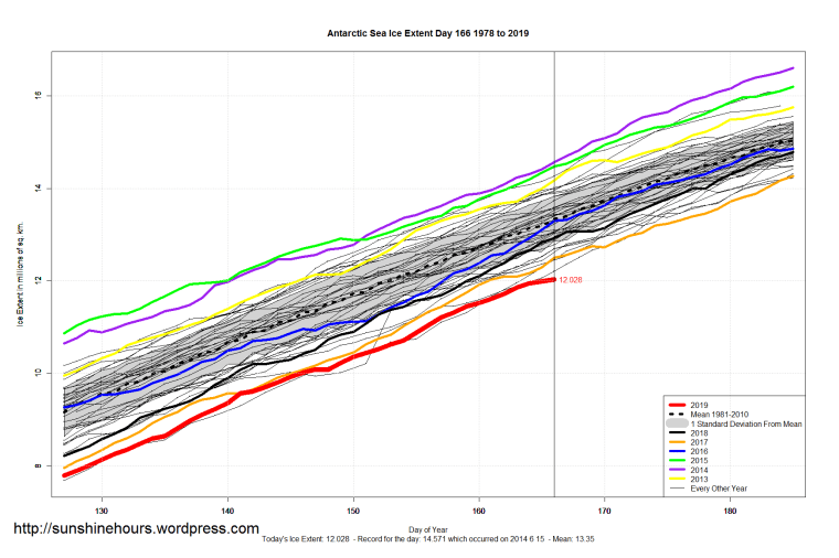 2 thoughts on “Sea Ice Extent (Global Antarctic and Arctic) – Day 166 – 2019
