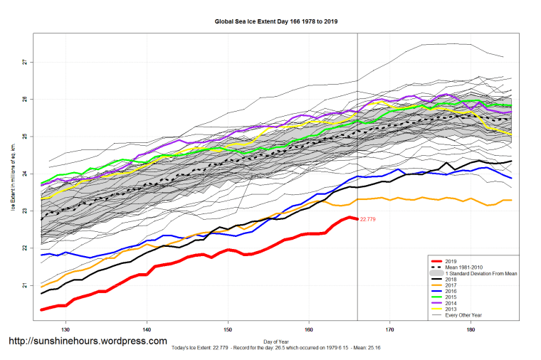Sea Ice Extent (Global Antarctic and Arctic) – Day 166 – 2019