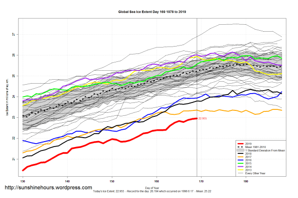 Sea Ice Extent (Global Antarctic and Arctic) – Day 169 – 2019